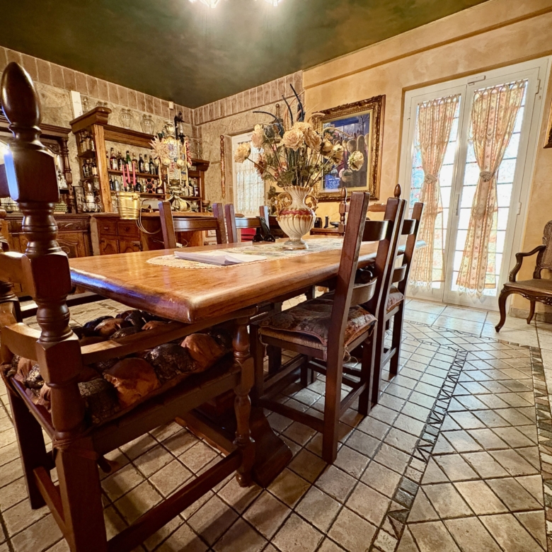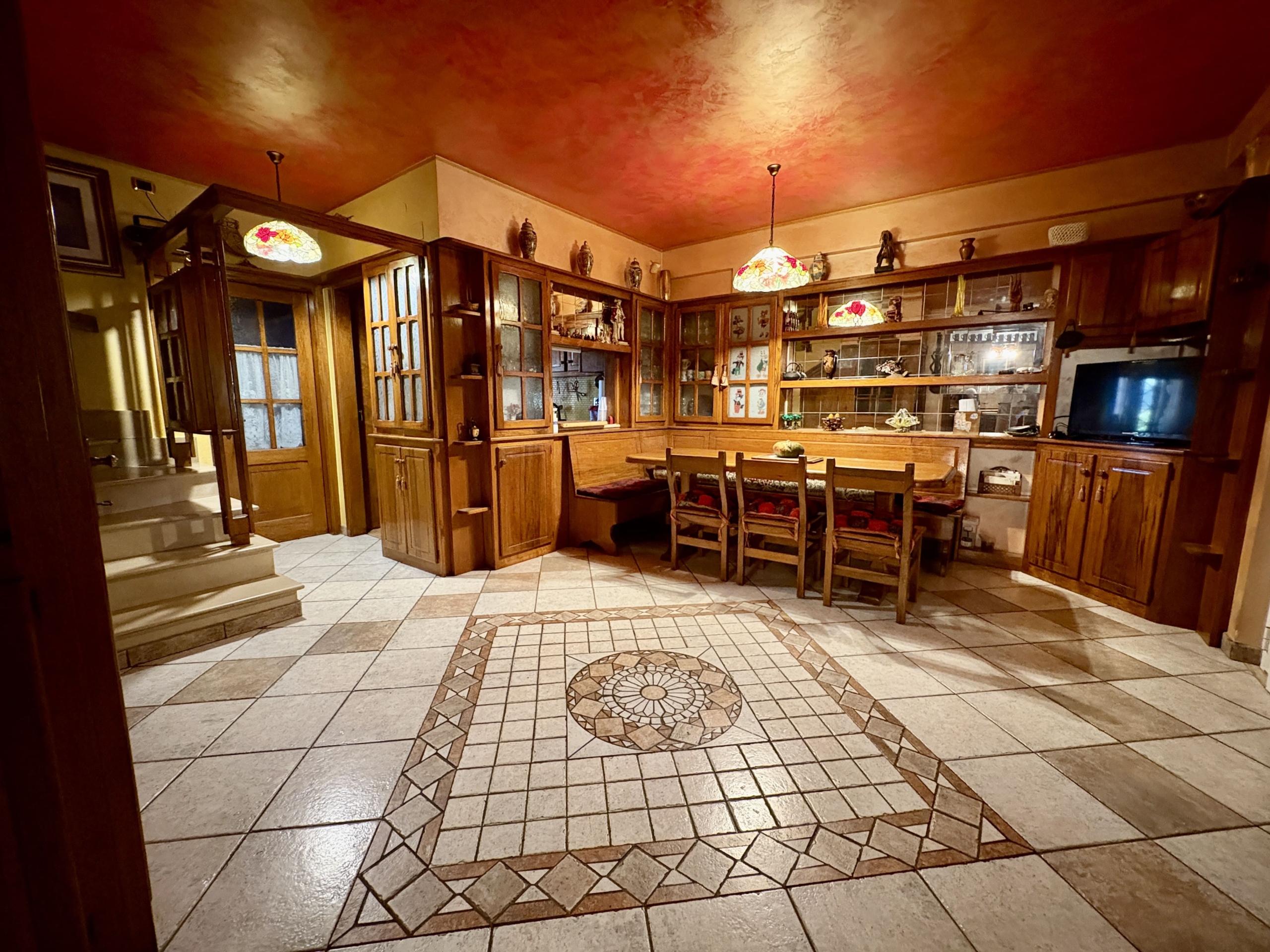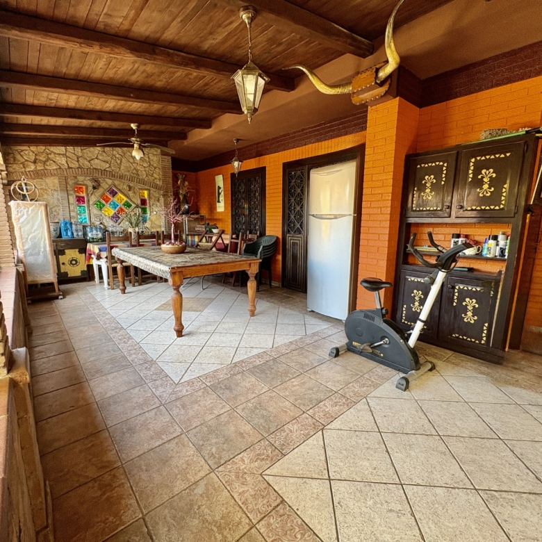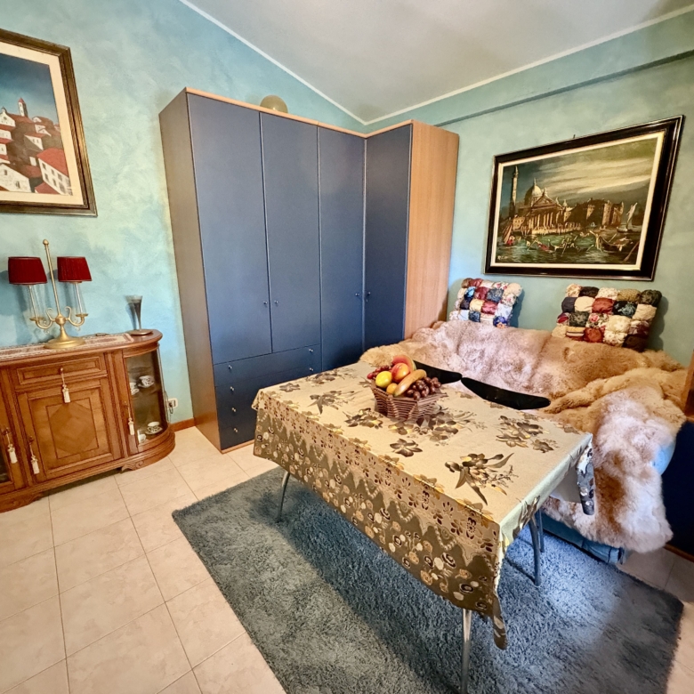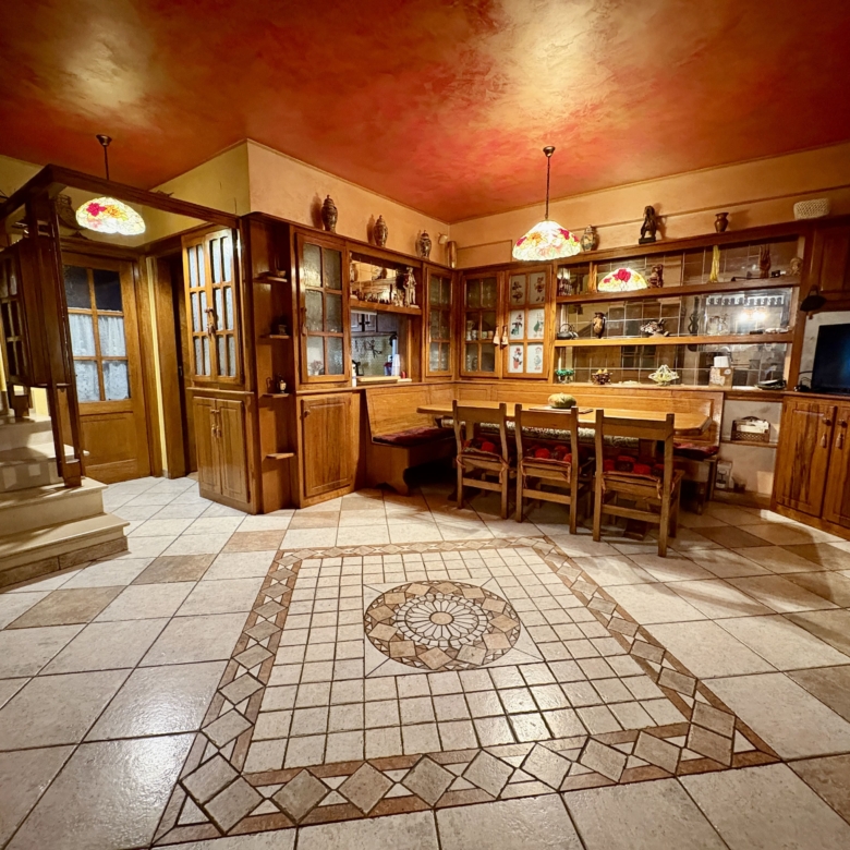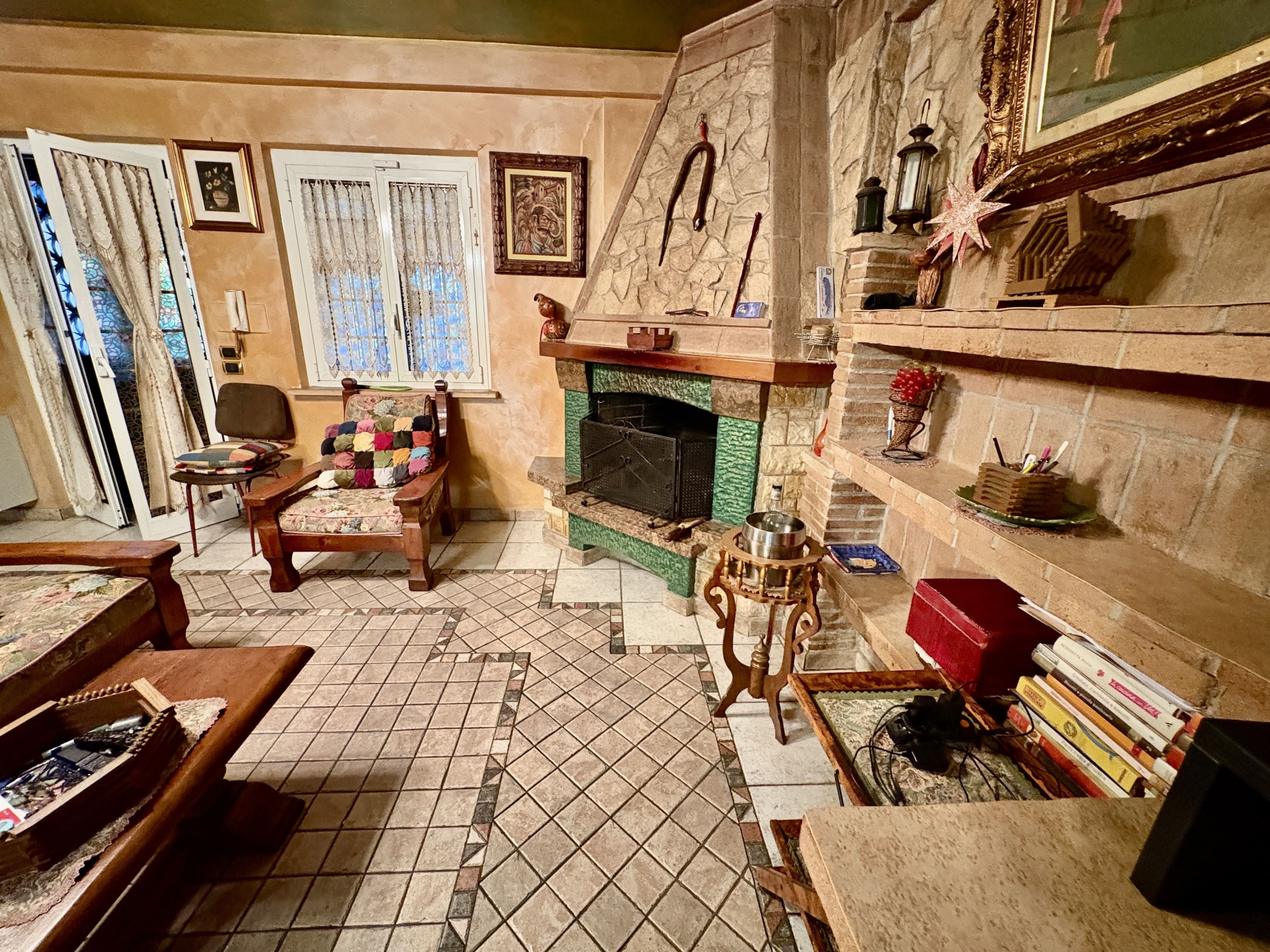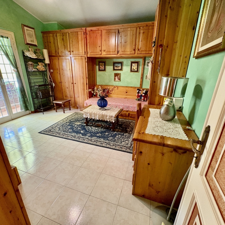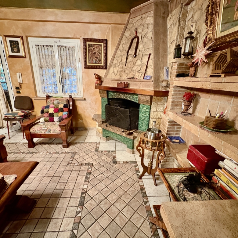 Al piano terra l’abitazione si apre su un soggiorno con cucina funzionale seguita da un bagno di servizio e da un luminoso salone doppio. Quest’ultimo, collegato da porta-finestra sia alla veranda che al giardino sul retro, è arricchito da camino e caratteristico angolo bar in legno con rivestimento in porfido che rappresenta il cuore della zona giorno, perfetto per momenti conviviali e familiari.